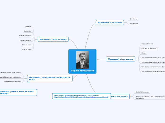 Les événements importants de sa vie Maupassant et sa carrière Maupassant et ses oeuvres Maupassant et son époq. Le professeur de français ajoute des petites précisions et modifications pour la recherche à venir qui porte sur Guy de Maupassant Le rendu demandé est la carte elle-même sur format A3 en couleur et illustrée. En vue du Bac de Français nous vous proposons ici une courte biographie de Guy de Maupassant 1850 - 1893 lauteur de Bel Ami dUne Vie de Boule de Suif et du HorlaOn rattache Maupassant à deux courants littéraires importants du 19ème siècle.