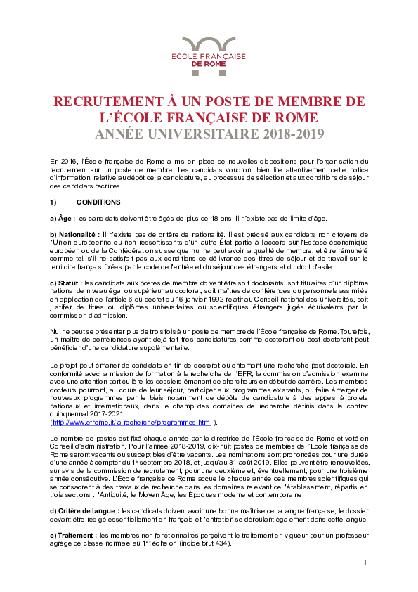 Pdf Recrutement A Un Poste De Membre De L Ecole Francaise De Rome Annee Universitaire 2018 2019 Ecole Francaise De Rome Academia Edu