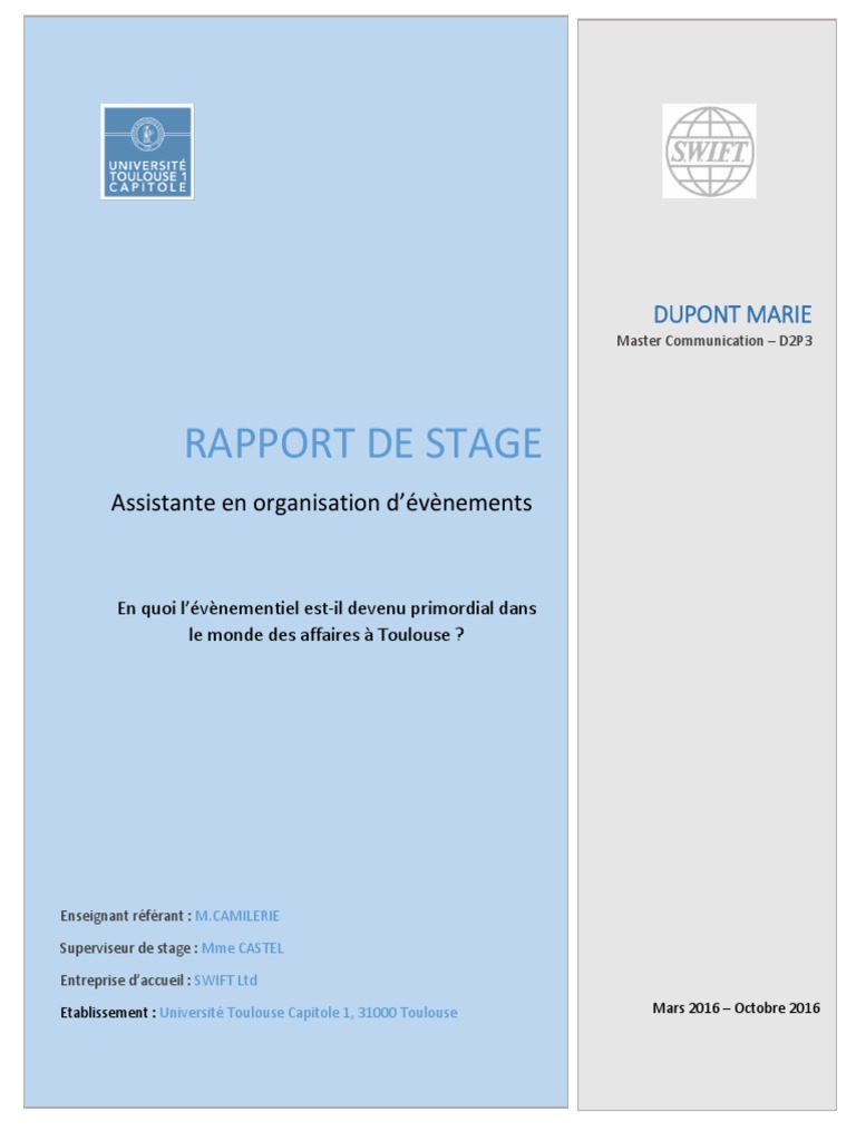 La page de garde ou couverture dun rapport de stage est la première page couverture de votre document reprenant les éléments clés du stage.