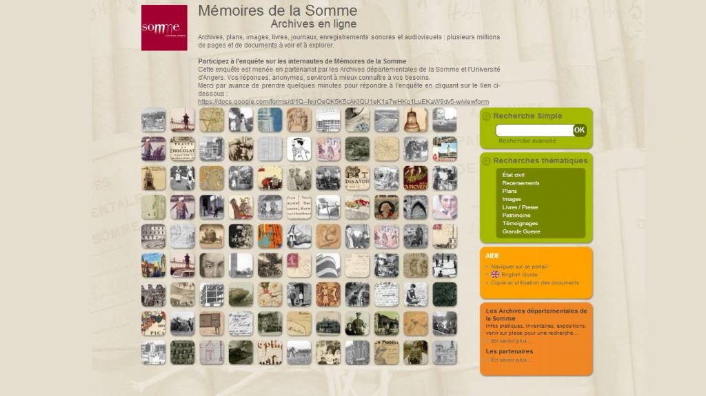 Cette enquête nationale réalisée en 2020 porte sur les ressources et la valorisation de ces archives sur les sites Internet des Archives départementales et du minutier central des notaires de Paris aux Archives nationales. Etat civil et recensements. Site tenu à jour par les Archives départementales de la Somme.