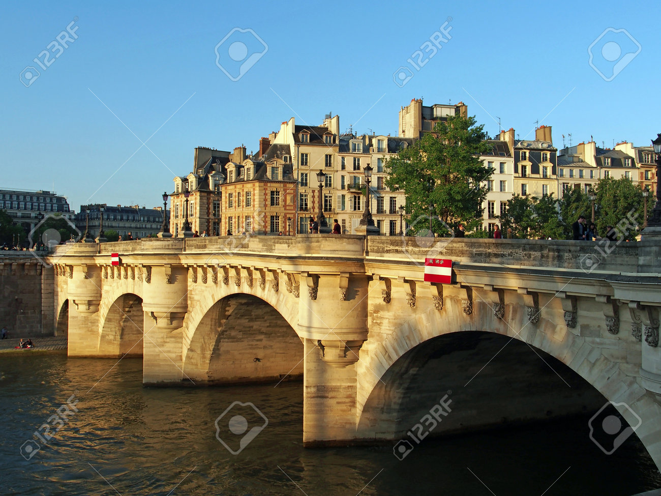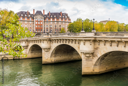 Il traverse la Seine à la pointe ouest de lîle de la Cité. Un pont qui à lépoque de sa construction fin 16e début 17e était le premier pont à traverser entièrement la Seine le premier à être construit avec de la pierre et enfin le premier à être doté dun trottoir pour les piétons. Sur les ponts de Paris.